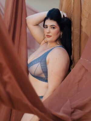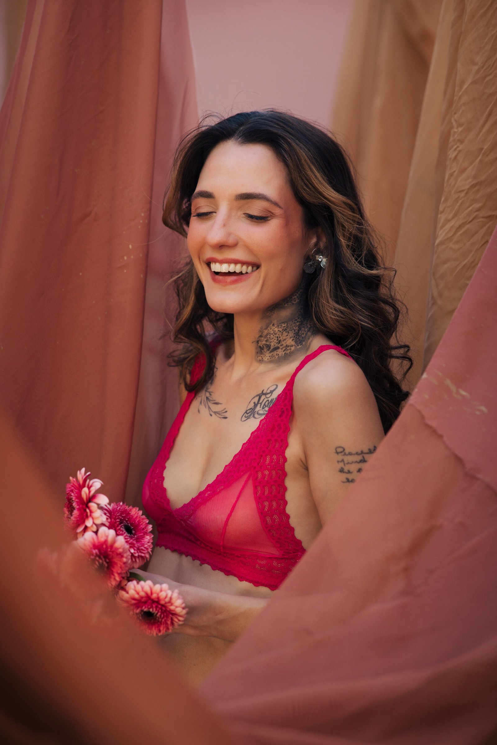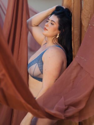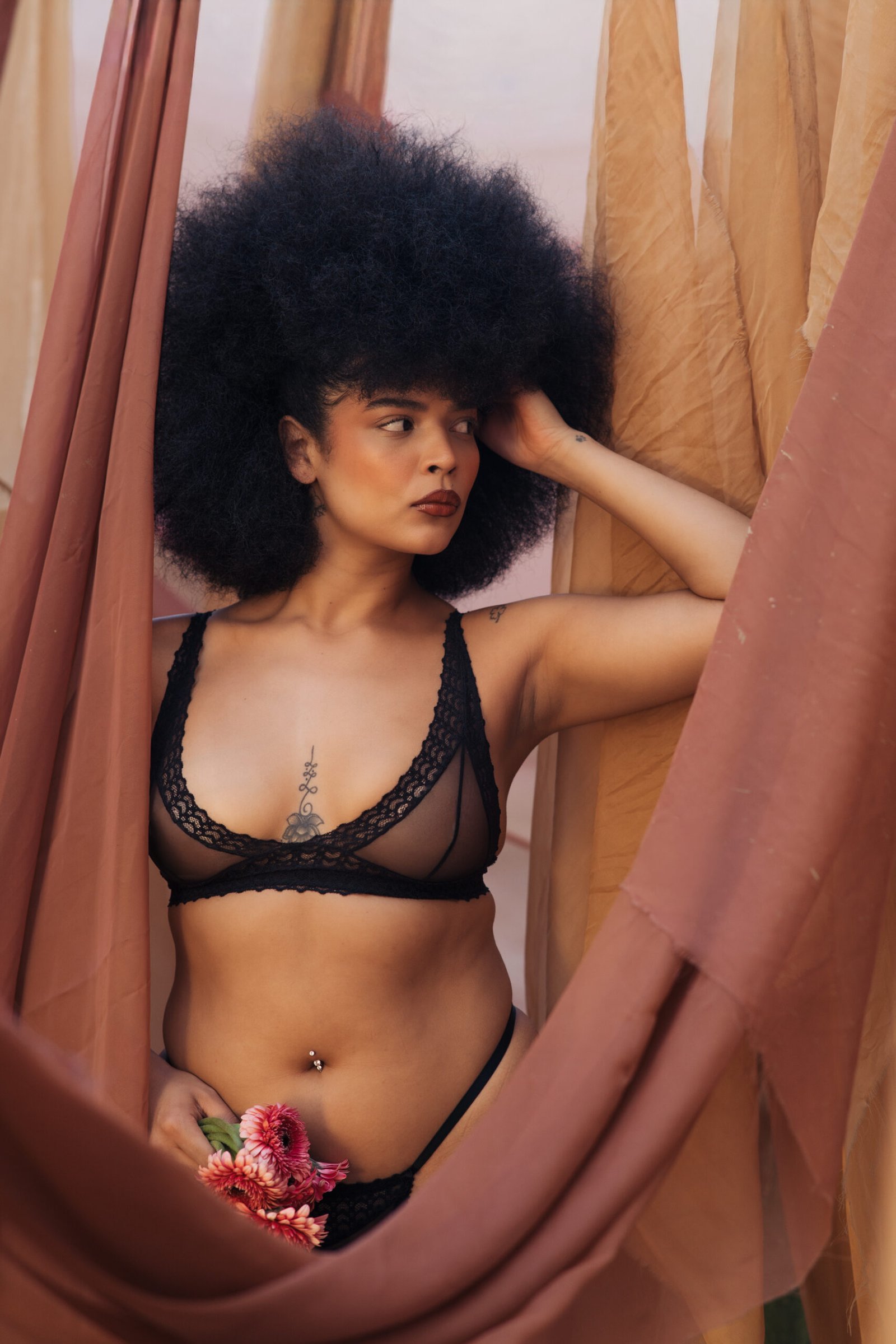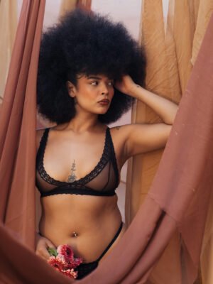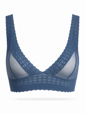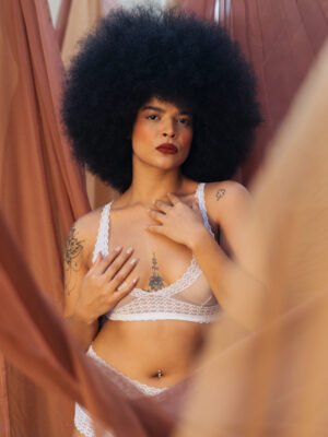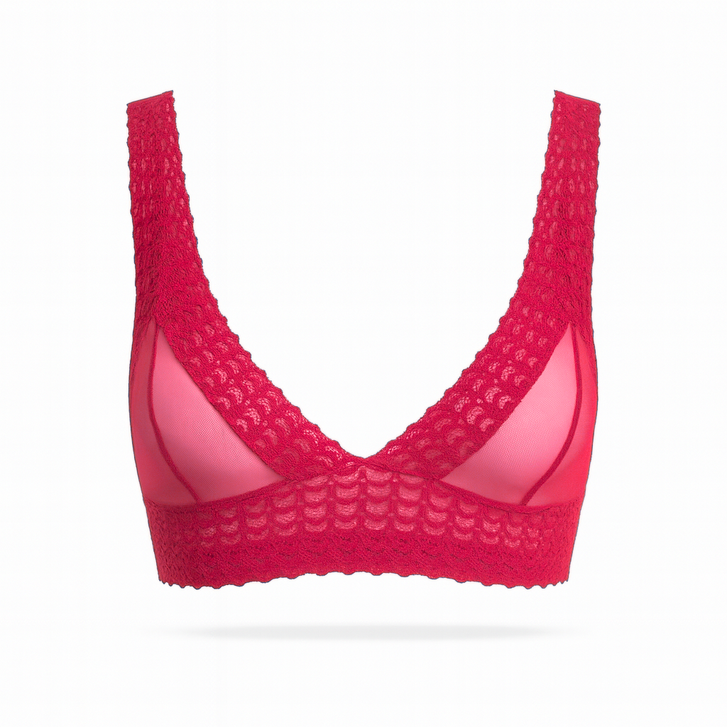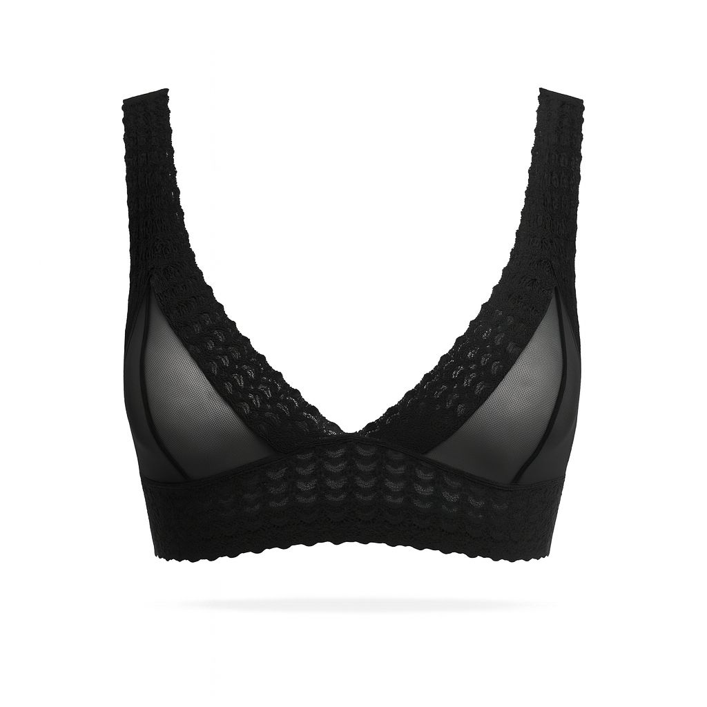 Triângulo sem bojo, confeccionado em renda e tule premium. Detalhes estratégicos realçam suas curvas com delicadeza e transparência. Reguladores nas alças e nas costas permitem ajuste perfeito.