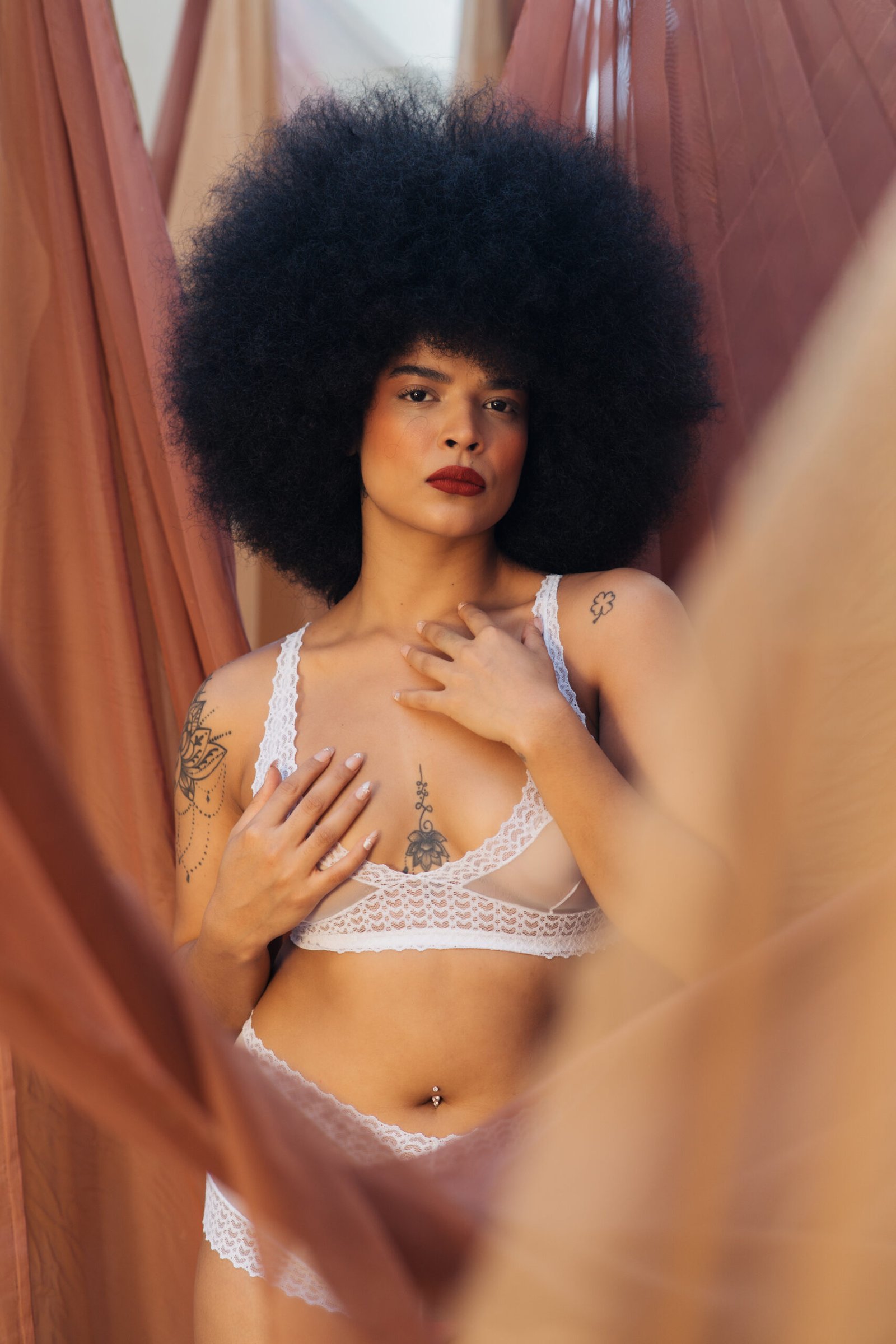 A qualidade dos materiais é um diferencial indispensável neste triângulo. A combinação da renda e do tule premium não apenas eleva o padrão de estética, mas também garante suavidade em contato com a pele.